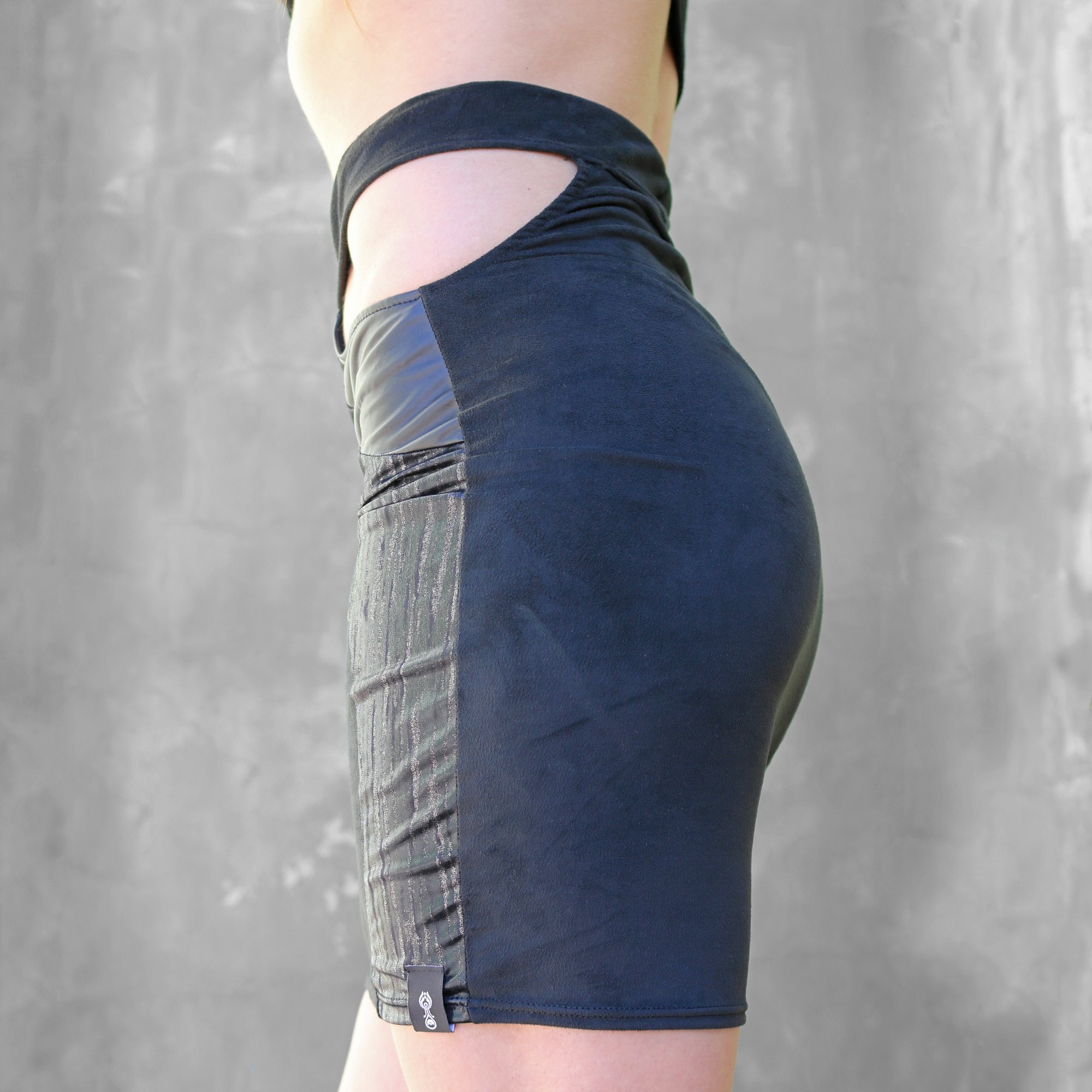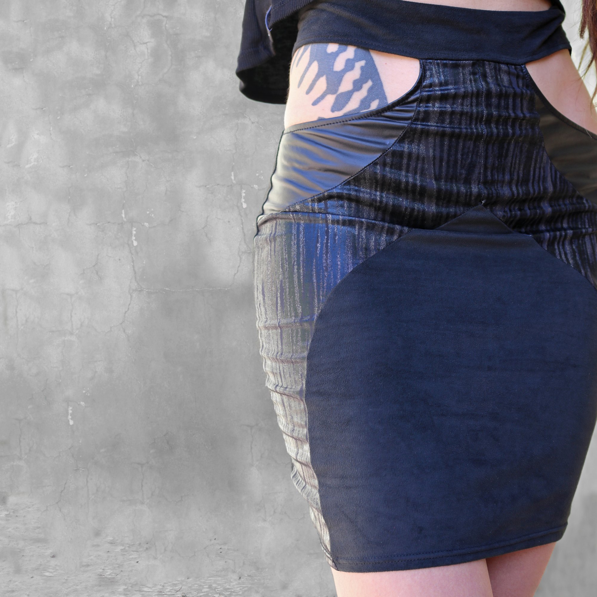A mix of textures and fabrics, blending the softness of suedine with a faux leather and a very particular spandex fabric with silver and grey lines.