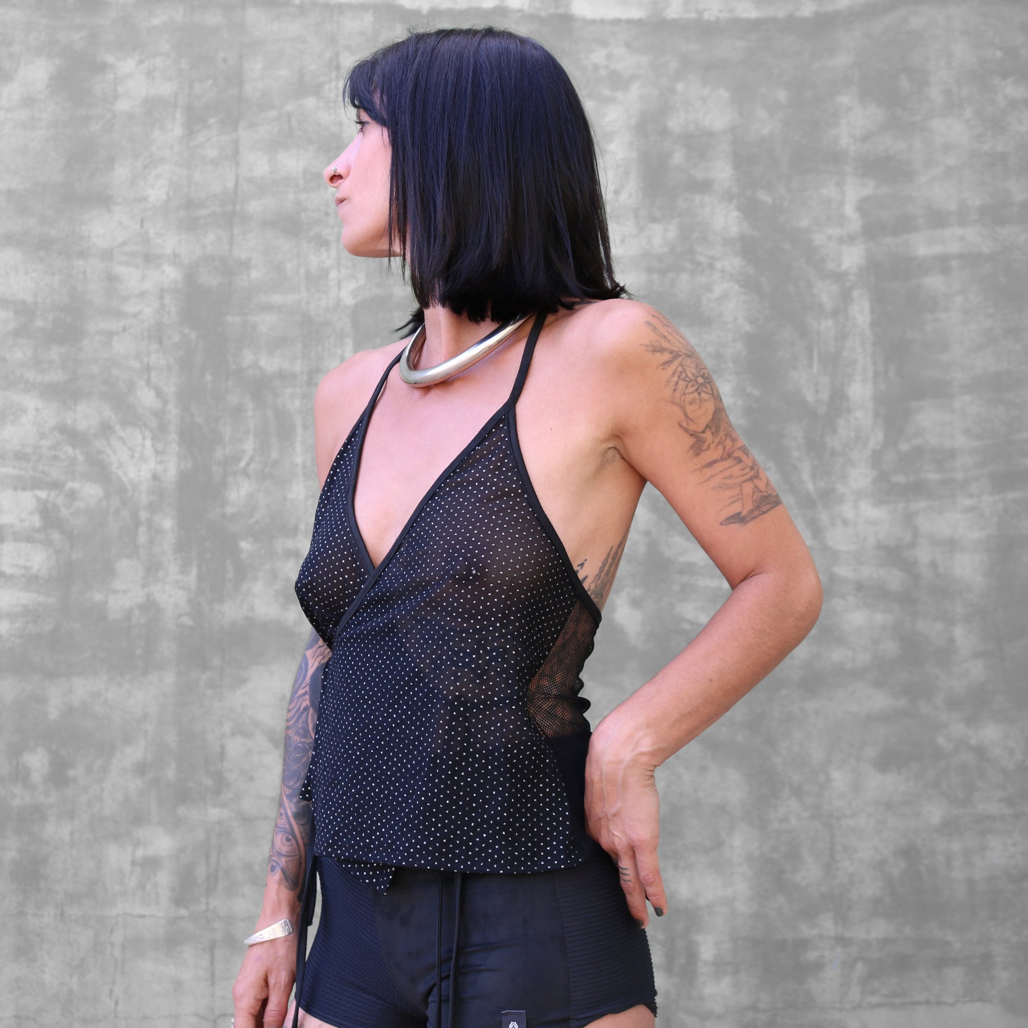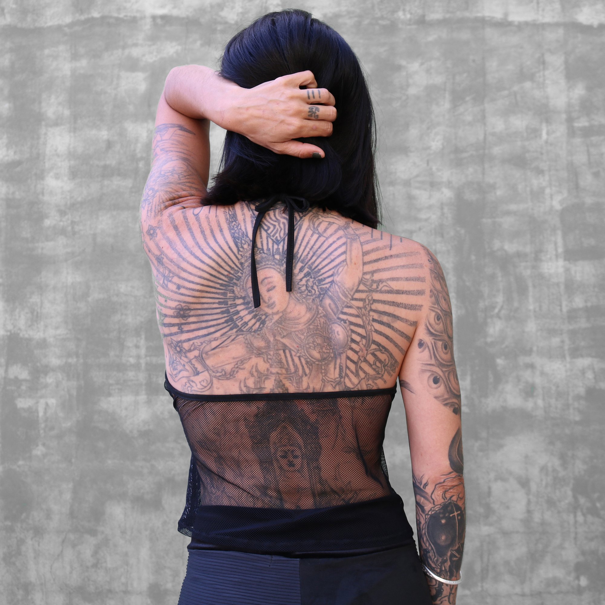 This elegant shirt has black mesh on the backside that shows the bare skin and looks amazing with tattoos.