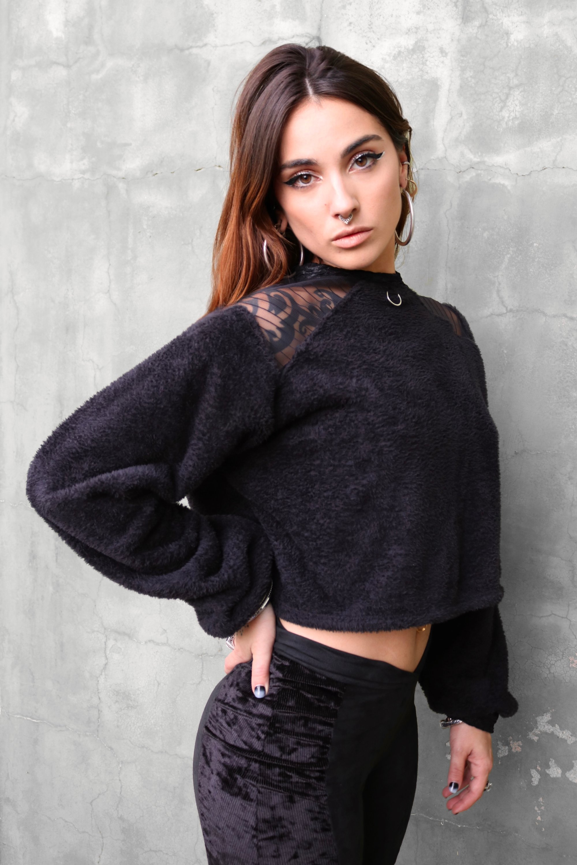 This fluffy oversized shirt has transparencies on shoulders, that shows the delicate clavicle.