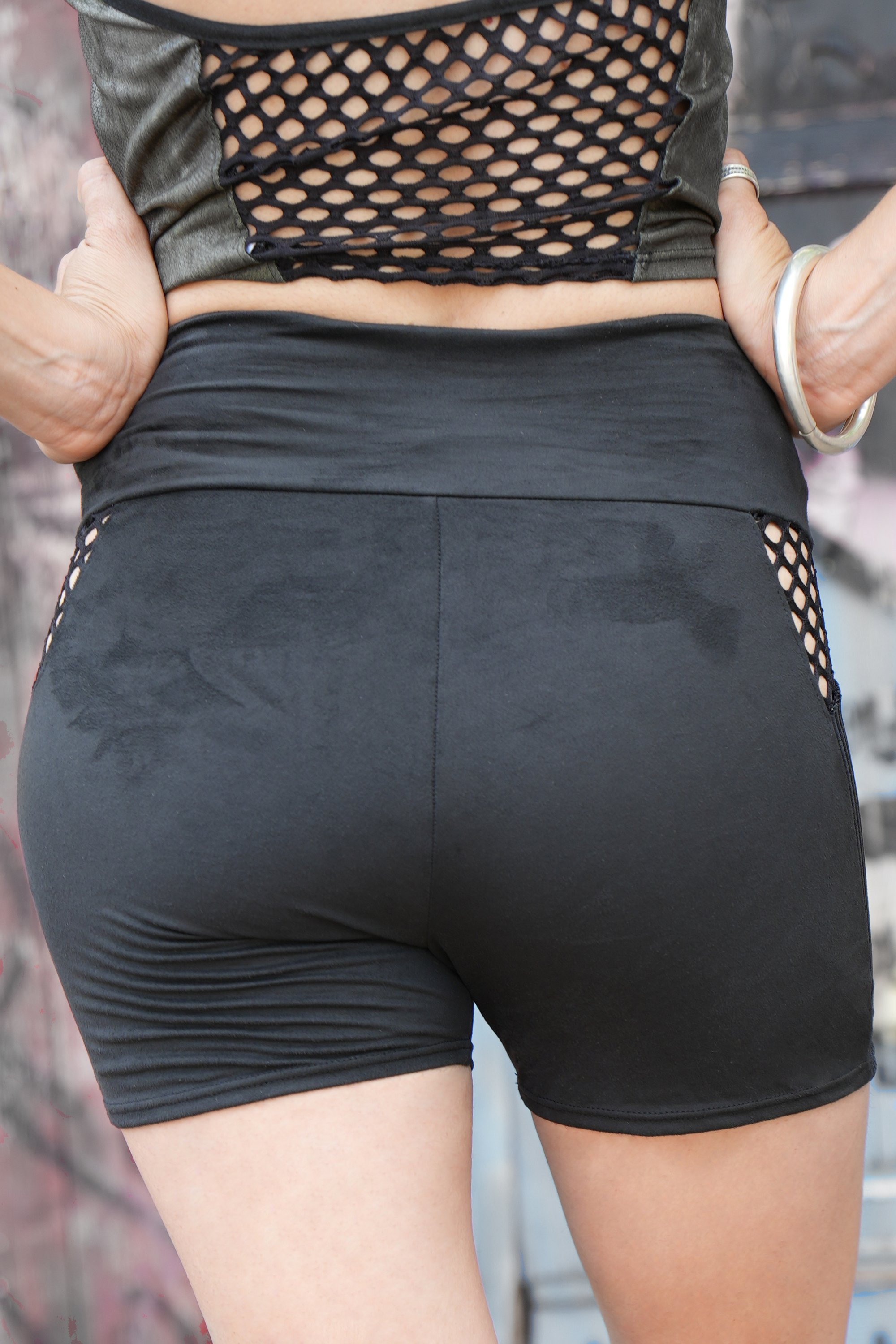 With a soft feel, it combines suedine fabric with stretchy mesh and velvet featuring silver stripes, bringing an elegant flair to this urban shorts.