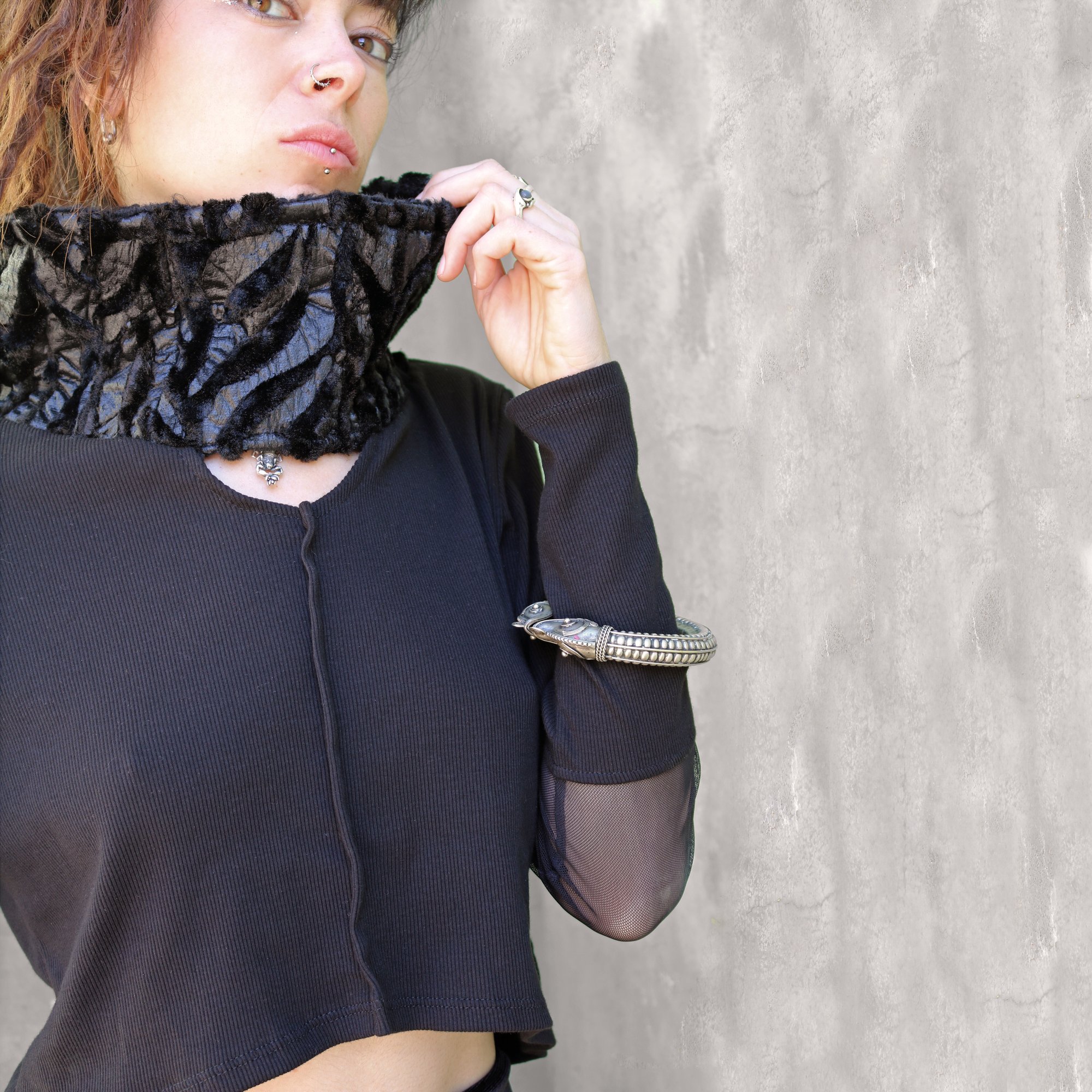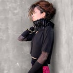 With sheer inserts at the elbows, a wide asymmetrical drape, and a rounded opening beneath a giant zebra-print collar, it’s the new favorite!