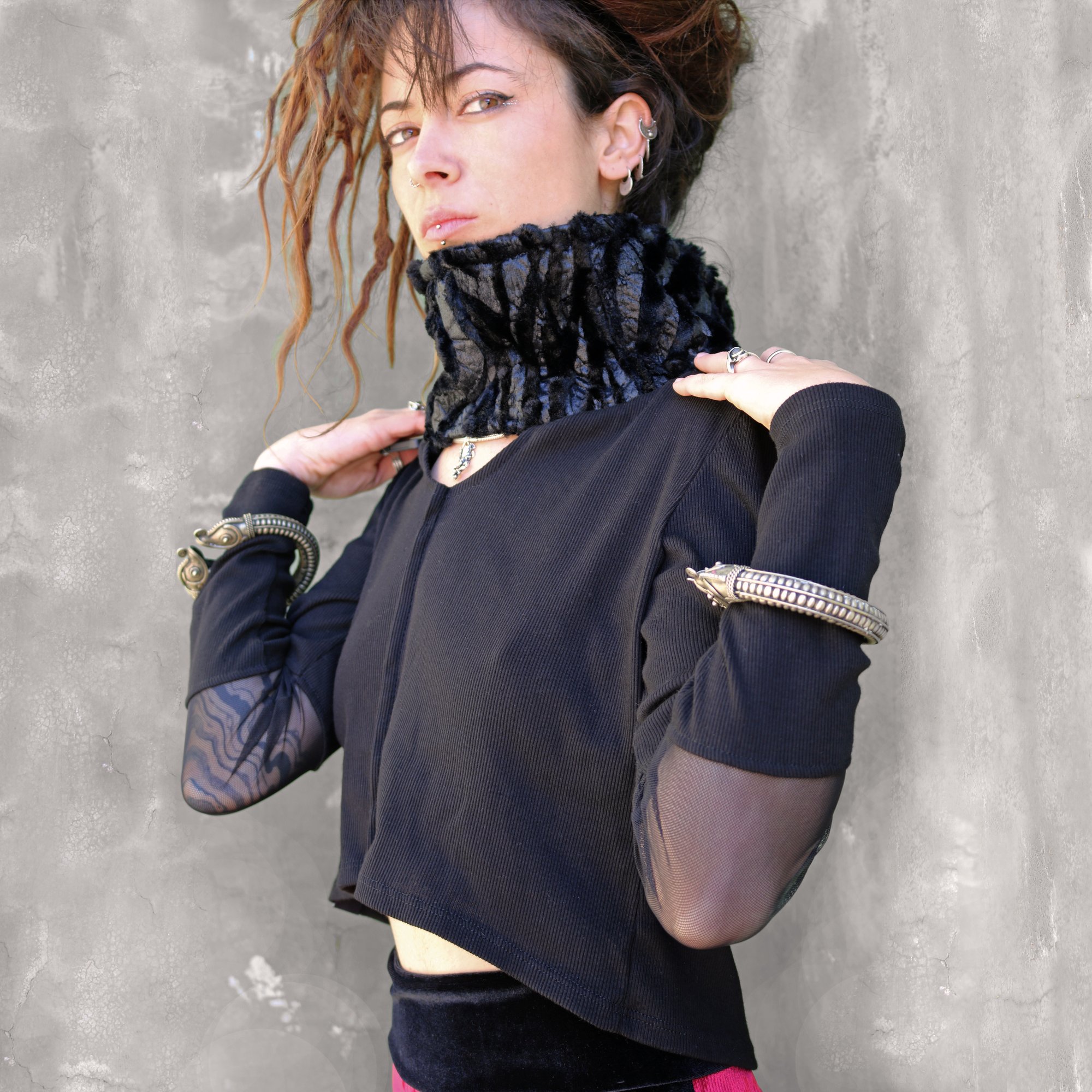 This versatile T-shirt is a two-in-one piece featuring an oversized built-in neck warmer.